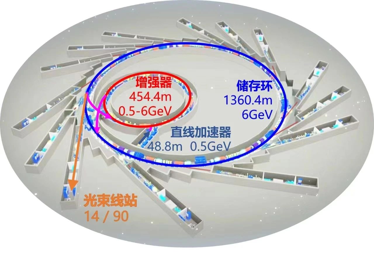 目前我国的大型环形加速器包括上海光源(SSRF)的储存环(周长432米)、台湾光源(TLS)的储存环(周长120米)、台湾光子源(TPS)的储存环和增强器(周长分别为518.4米和496.8米)。HEPS增强器的周长为454米,由四个超周期对称结构组成,目前是大陆最大的环形加速器,在相同规模周长情况下,它的能量却高出近1倍。增强器是一种环形加速器,更高能量的环形加速器,通常采用较长的周长来获得更好的束流品质和寿命。