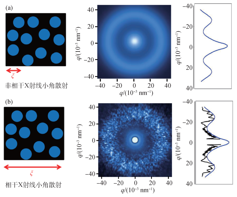 图2 (a)利用nano-ARPES测量双层石墨烯异质结器件的示意图,光子经过菲涅耳波带片被聚焦到样品上,然后从样品上出射的光电子被探测器收集;(b)当电流通过时,不同位置的能带测量结果[21]第四代光源的高亮度和相干性将极大地提升空间分辨率和单位面积上的信号产额。举例来说,正在建设中的合肥先进光源的极紫外波段经过波带片聚焦之后,nano-ARPES实验样品上的光子数是当前第三代光源上的同类型实验站的7倍,这将大幅度提高数据的信噪比和实验效率。许多在第三代光源广泛应用的谱学实验技术也可以应用于第四代光源的线站,利用高亮度的聚焦X射线以及高空间分辨率的优势进行成分、价态、磁性和电子态的表征。结合二维逐点扫描的数据采集方式,为谱学测量增加了空间的维度,实现了“谱学”与“显微”的功能。第四代光源能够在前所未有的细节水平上探索小样品区域,在研究非均质体系和器件等方面具有显著优势,从而可以揭示多个量子自由度在微观尺度上的相互作用机制。在散射实验中,X射线的相干性差异会导致探测信号显著不同。图3展示了一束具有空间相干度ξ的X射线照射在一个无序排列的纳米球体系上所产生的散射信号。当该无序体系被非相干X射线照射时,其空间相干长度较小,散射产生的二维图案和一维散射信号的强度包含了少量与纳米球平均大小和形状相关的特征峰。而当X射线具有良好的相干性,其空间相干长度较大时,二维散射图案会出现许多斑点。这些斑点被称为散斑,是由于无序排列纳米球散射的光的波前之间的相互干涉所形成的,而这些斑点也对应于一维散射谱中的细小尖峰。因此,散斑图案既包含了与非相干X射线相同的形态信息,即物体的大小和形状,同时也编码了纳米球在空间中的相对位置。因此,利用散斑可以确定无序体系中的结构特征[22]。