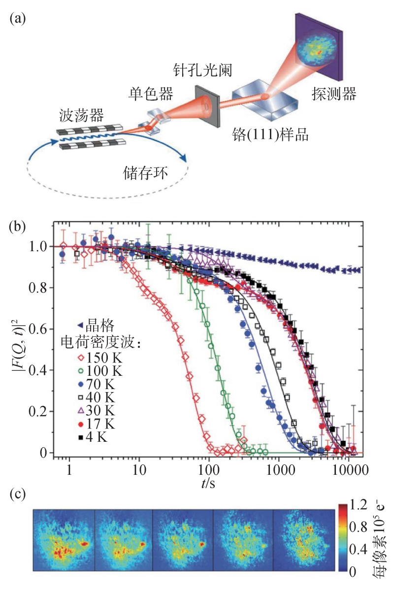 图3 X射线小角散射(SAXS)实验 (a)非相干X射线照射下无序纳米球体系的二维和一维散射图案;(b)相干X射线照射下产生的二维和一维散射图案[8]。其中,左侧是无序纳米球体系的示意图,中间是二维散射图案,右侧是一维图案在第三代光源上,由于X射线的相干性较低,散斑图案会被抑制,因而散射信号形成的强度变化呈现平滑的弥散分布。然而,利用第四代光源所提供的具有空间相干性的X射线,散斑图案将得到保留,其强度分布可以反映样品的精确结构[23]。如果样品不是静态的,而是存在动态变化,那么散射图案也将发生相应的演化。基于相干X射线散射的X射线光子相关光谱学(X-ray photon correlation spectroscopy,XPCS)可以利用归一化强度相关函数来分析一系列散斑图案随时间或外部变量(如磁场、电场或温度)的变化,从而提供有关样品微观动态行为的信息[24]。由于相干衍射所产生的对比度可以来自化学、磁性和结构的特征,因此XPCS能够揭示多种复杂现象的时间依赖性,包括复杂自组装、畴壁运动,以及磁性与电子态的涨落等[25—28]。图4展示利用XPCS技术在铬(Cr)中探测电荷/自旋密度波的量子涨落。散斑图案与磁畴构型密切相关,随着时间流逝,散斑的关联性逐渐衰减,这意味着磁畴构型发生了变化。在较低温度下可以看到,散斑关联性的时间依赖性不再随温度的变化而变化,这说明高温时磁畴壁的运动受到热效应的影响,而在较低温度下量子涨落的作用更显著。