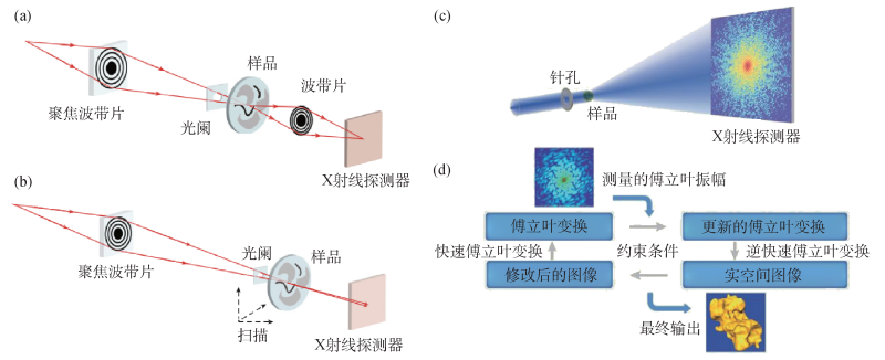 图4 (a)在同步辐射装置上进行散斑实验的布局示意图;(b)散斑的强度相关性随温度和时间的变化;(c)在T=17 K时一系列的散斑图案,采集数据的时间间隔约为1000 s[24]相干X射线散射技术用于研究动力学现象时与泵浦—探测技术有所不同。在泵浦—探测技术中,被研究的物理过程会有选择性的受到外部的重复激励,而XPCS探测结果则展示了在没有外部激励的情况下物质体系的变化[29]。在实际应用中,XPCS测量的时间分辨率与相干X射线通量的平方成正比,而相干通量又与光源亮度的平方成正比。随着衍射极限储存环光源的升级,相干X射线通量可以提高近3个数量级,从而XPCS的时间分辨率可以提高5到6个数量级,从理论上讲,可以达到纳秒级分辨率。近年来,在同步辐射装置上,X射线成像技术的空间分辨率得到了显著提高。硬X射线波段的成像已经实现了优于30 nm的三维空间分辨率,而软X射线波段的成像空间分辨率达到10 nm的水平。利用同步辐射能量连续可调的优势,X射线成像技术能够与谱学研究手段相结合。当X射线能量连续改变时,样品中不同化学成分会产生对应的不同信号。因此,一系列在不同X射线能量下采集的成像数据相当于一系列具有纳米级空间分辨率的X射线吸收谱。多方面的光源优势和技术进步促使成像技术进一步发展,使其能够获取三维结构、化学成分与价态、动态过程等信息,从而拓展了X射线成像技术的应用范围。X射线成像可分为三种类型:扫描显微镜、全场显微镜和相干衍射成像,如图5所示。在第三代光源上,成像技术以全场成像和扫描成像为主。前者类似于透镜放大的方式,利用X射线光学元件放大样品的结构,并在探测器上成像。这种方法最主要的光学元件是波带片,波带片的最外环宽度决定了这种放大成像方法的空间分辨率。扫描成像是利用聚焦元件将X射线聚焦成小的焦斑,然后通过逐点扫描方式获得样品的二维信息,其空间分辨率极限对应于聚焦光斑的尺寸。