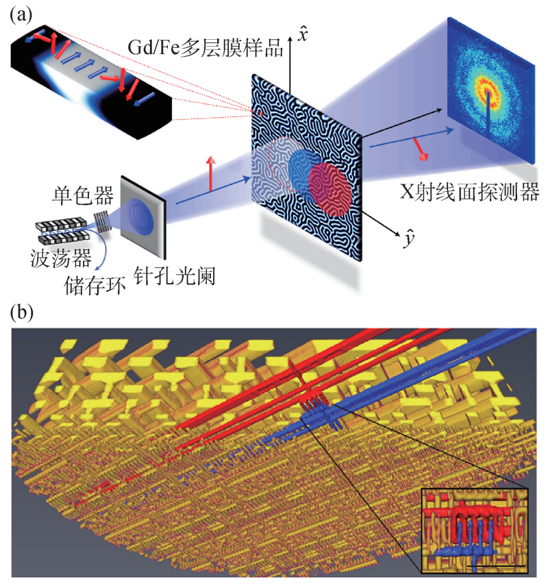 图6 (a)利用Ptychography技术测量Gd/Fe多层薄膜中磁畴结构的示意图;(b)利用相干衍射成像技术获得的集成电路三维精细结构图像[36,37]