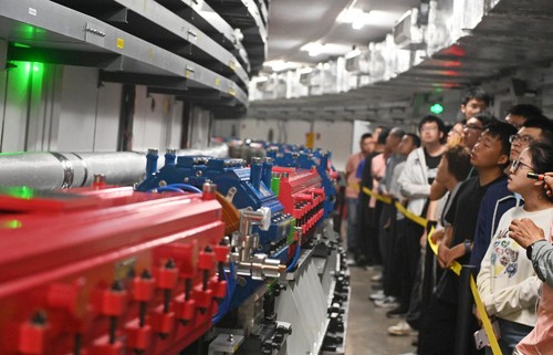 图为观众在高能同步辐射光源增强器隧道参观增强器。