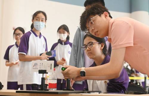 图为学生参与科普小实验——以光丈发,通过光学衍射效应,测量发丝直径。