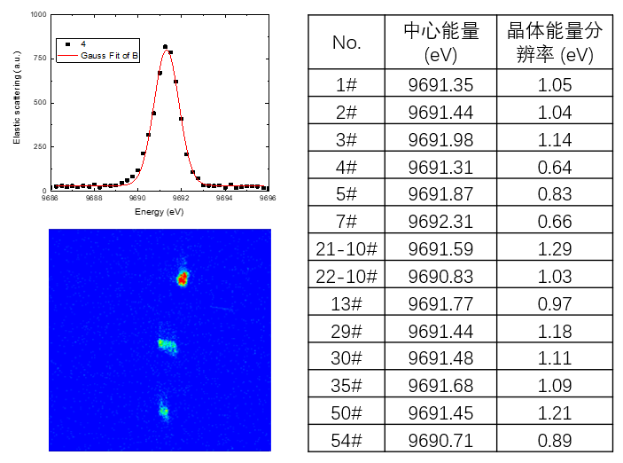 在HEPS工程指挥部的部署下,HEPS高能量分辨谱学线站团队与光学设计、光学机械、光束线控制系统相关人员,联合多学科中心晶体实验室积极攻关。线站核心成员郭志英、多学科中心晶体实验室刁千顺,经过多年技术攻关和反复尝试,不断改进优化分析晶体制备工艺,最终探索出兼顾能量分辨与聚焦特性于一体的球面弯曲分析晶体制备方法。今年10月2日-5日,项目团队在北京同步辐射装置(BSRF)1W2B线站上,采用Si(111)双晶单色器Si(220)切槽单色器两次单色化、毛细管微聚焦的光学配置,利用自研三元谱仪样机,对谱仪单模组内15块分析晶体(图1),采用EPICS-Bluesky控制系统实现单色器联动扫描,开展了批量、高精度指标测试(装置见图2)。优化后入射能量带宽实现高分辨,达到半高全宽0.8eV@9.7keV,分析晶体自身能量分辨(图3)达到半高全宽~1eV@9.7keV,与理论预测值相当,聚焦特性得到充分验证(图3、图4),各项指标全部满足工程设计需求。