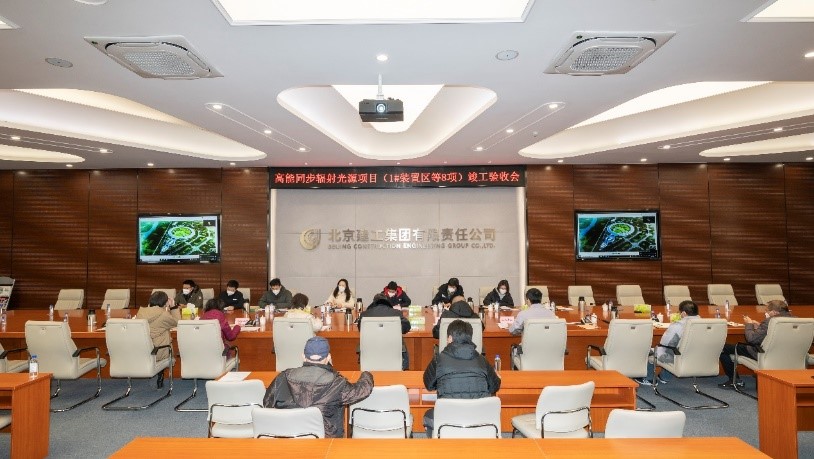 高能所作为建设单位组织此次竣工验收,提前成立竣工验收组,验收组成员包含设计、勘察、监理、施工单位项目负责人和现场技术、质量负责人。竣工验收会在怀柔召开,由建设单位基建及园区建设部主任周敏主持,怀柔区质量监督站(区质监站)全程参会监督验收,主管副总指挥梁键出席会议。根据住建委验收程序及要求,参建五方代表向验收组汇报了预验收意见,从项目概况、建设手续办理、设计情况和施工措施方案、监理质量管控情况等进行竣工总结,以及汇报了竣工验收的前置条件所具有的各专项验收合格,包括无障碍设施验收、节能验收、室内空气质量检测、防雷检测、电梯验收、人防验收及规划验收。随后区质监站和竣工验收组分为土建组、电气组、水暖通风组,分别对现场实体工程、工程图纸和资料进行了质量抽查和查阅。经现场抽查和讨论,区质监站及竣工验收组一致同意HEPS建安工程(1#装置区等8项)验收合格,并就完善意见建议留有备忘录。