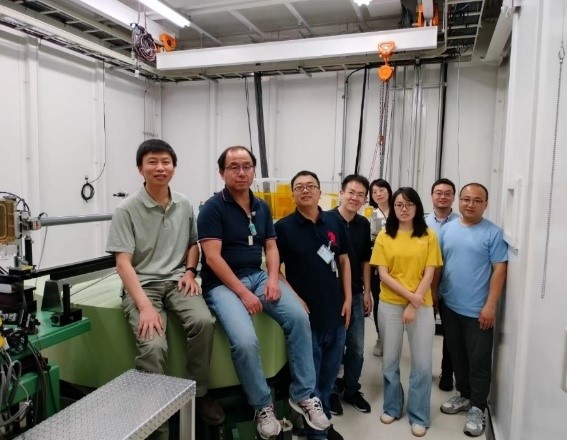 图4. 测试团队在上海光源稀有元素线站7元1m-XES谱仪前合影,(从左到右) 郭志英、徐伟、曾建荣、杨俊亮、张玉骏、刁千顺、靳硕学;