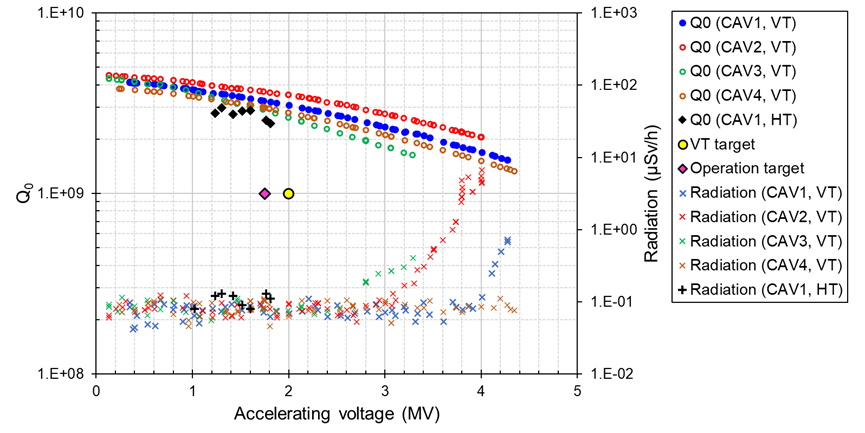 测试结果表明:在4 K温度下,加速电压在1.75 MV时(HEPS运行值),500 MHz超导模组的品质因数达到2.6E+9,模组的静态热负载为20.3 W,动态热负载为12.8 W,无场致发射,未发现腔内二次电子倍增效应。受测试功率源最大功率限制,模组测试时最高腔压为1.81 MV,对应耦合器连续波功率155 kW,场致发射引起的最大剂量值小于0.1 μSv/h,与裸腔垂直测试水平相当。