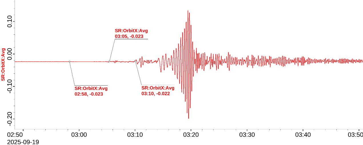 9月19日凌晨,HEPS调束团队在储存环束流调试期间记录到了前后持续约一小时的轨道异常波动数据(见图1)。2时50分前,HEPS储存环运行稳定,束流水平轨道波动幅度峰峰值约0.3微米。3时05分左右,束流水平轨道开始出现小幅度(幅度达到约10微米)异常波动,随后逐渐减弱。3时10分,异常波动幅度明显增大(幅度达到约30微米),随后再次减弱。3时14分,振幅开始显著增大,并于3时19分达到峰值(幅度达到约330微米),随后迅速减弱。