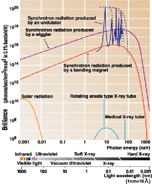 同步辐射从红外线、可见光、真空紫外、软X射线一直延伸到硬X射线(如图),是目前唯一能覆盖这样宽的频谱范围又能得到高亮度的光源。利用单色器可以随意选择所需要的波长,进行单色光的实验。