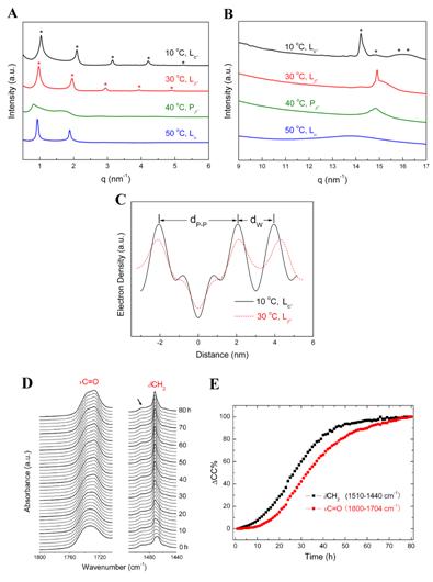 图1 利用北京同步辐射装置(BSRF)小角X射线散射线站(1W2A)获得的DPPC–H2O体系的Lc’、Lβ’、Pβ’和Lα的SAXS(A)和WAXS(B)结果,以及由SAXS结果得出的Lc’和Lβ’的电子云密度计算结果(C)。SAXS和WAXS分别给出了DPPC分子各个相态的结构(包括层间距)和排列情况,而电子云密度计算则给出了磷脂双层厚度和层间水合层的厚度信息。(D)和(E)分别给出了在3 °C下DPPC由Lβ’逐渐转变为Lc’过程的FTIR结果以及相应的图像分析处理结果。dCH2代表能够反映磷脂尾部排列情况的CH2弯曲振动,nC=O代表能够反映磷脂界面区构象和水合情况的C=O伸缩振动.
