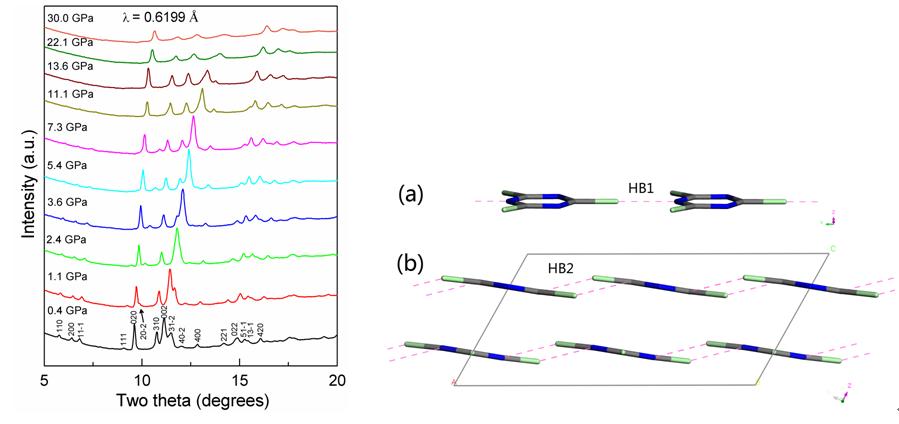 图2 三聚氰氯晶体的高压XRD谱 图3高压下三聚氰氯晶体的晶体结构和卤键结构