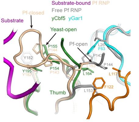 图1酵母H/ACA Cbf5-Nop10-Gar1复合物的晶体结构,以及和古细菌H/ACA RNP的结构比对。