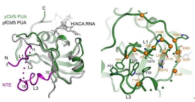 此外,人类的Cbf5蛋白质发生突变后会引起一类罕见的先天性角化不良遗传病(dyskeratosis congenita)。真核生物Cbf5特有的N端延伸区域是疾病突变的高发区。酵母Cbf5的结构揭示了该N端延伸在PUA结构域上形成了额外的结构层,为研究突变对疾病的影响提供了更准确的结构模型(图3)。