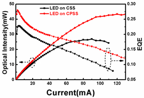 在碳纳米管图形化衬底上生长并制备的LED器件,与常规蓝宝石衬底上制备的LED相比,除了光功率的提高外,LED的饱和电流和饱和光功率提高均达50%-60%。 LED的光功率饱和现象主要来源于工作状态下的热量沉积,正是碳纳米管极好的导热性能使得LED工作的电流容量大大提高。这提示碳纳米管掩膜技术具有应用于大功率器件的重要前景。
