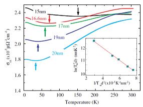此外,通过测量电导率温度系数随厚度的变化(图3),我们定出了铋从半金属转变为半导体的转变点。在了解了铋薄膜的输运性质是由金属表面态和薄膜内部的半导体共同参与所组成的基础之上,我们建立模型,通过定量的结果证实了铋薄膜的电导率随厚度、温度的非单调变化关系(图4)是源于表面态和体内此消彼长的竞争,对这些被广泛观察却没有被很好理解的现象做出了合理的解释。