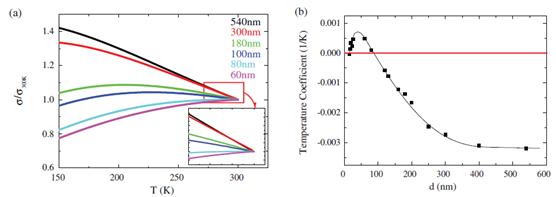 图3 (a) 不同厚度样品的电导率随温度的变化,右下是 270 K 到300 K 的放大图。(b) 270-300 K的电导率温度系数随厚度的变化。