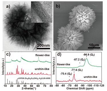 图1 a)花状硅酸锌的透描电子显微镜照片(插图:层状结构);b)海胆状硅酸锌的扫描电子显微镜照片;c)和d)二者的X射线衍射谱与固体核磁29Si。