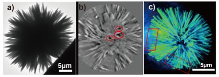 但是,海胆状硅酸锌的尺寸较大,常规的电镜表征手段难以看清其内部结构:扫描电子显微镜只能看清表面形貌,而透射电子显微镜的电子束又难以穿透样品(图2 a)。通常情况下,将样品通过外力弄破,可以间接知道其内部构造,从而猜测其组装机理。但是,这种破坏性的操作所引入的不确定性,又难以保证观察到的信息是真实的。利用北京同步辐射装置(BSRF)4W1A-X射线成像实验站获得的30 nm分辨率的海胆状硅酸锌的纳米CT结果(图2 b和c),可以实现无损情况下直接清楚的观察组装体的内部结构细节:疏松多孔的组装体内核,呈辐射状排列的组装单元以及未完美参与组装的悬挂单元。正是基于这些直接的实验事实,作者提出了最可能的组装机理:在溶液中,生成的棒状组装单元按辐射状排列,交合处形成疏松多孔的内核;同时,一些未参与组装的单元穿插在球体内。