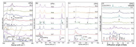 图2. (a)-(c) 方酸钠高压拉曼谱;(d) 方酸钠高压同步辐射谱。