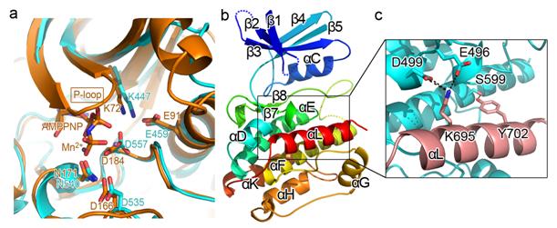 人类RSK1 CTKD的晶体结构。(a) RSK1 CTKD (青色)和PKA (橘黄色;PDB号:1CDK)ATP结合位点重合图。RSK1 CTKD 的P-loop的电子密度缺失,说明其没有稳定构象。起磷酸转移催化活性的氨基酸用sticks显示,并做了标记。(b)完整结构图。缺失的区域用虚线表示。(c) aL螺旋(粉色)与相邻结构(青色)的相互作用。