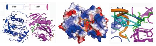 RsmE是由催化结构域和底物RNA识别结构域这两部分组成,其中在催化结构域中有一个“三叶草”形纽结,组成催化活性中心。采用小角散射方法研究了RsmE在溶液中的构象,与晶体结构的二聚体相比,它的二聚体溶液构象具有灵活性强和亚基间接触面积小的特点,这种柔性构象对底物RNA的识别和结合有重要作用。通过等温滴定量热方法研究RsmE对AdoMet的结合特性发现,两个AdoMet竞争性地结合RsmE二聚体中的两个活性位点,结果只有一个AdoMet能与RsmE结合。在此基础上,构建了RsmE-AdoMet-UMP三元复合物模型,在该模型中AdoMet和UMP结合到二聚体接触面上的三叶草结构附近,采用定点突变方法鉴定出了影响RsmE酶活性的关键氨基酸位点。这项研究揭示了RsmE催化的反应是由它的两个单体密切协作完成的,二聚化对保持它的活性是必需的。