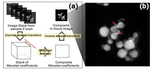 具体的实施方案是对厚样品做焦深z方向的扫描,采集一系列图像,扫描距离远大于焦深,这样不同厚度处的样品结构在不同的图像上表现出不一致的离焦/在焦现象,如下图所示,通过样品Z方向扫描,我们得到了一系列的图像(图(a)左上)。样品是一个在两侧标记微米大小金颗粒的双层75微米厚的聚酰亚胺薄膜,总厚度大约在220微米左右,大大超过了50微米的焦深。样品从整体欠焦的位置,通过Z扫描,分别经过前/后表面在焦的位置,最终整个样品达到整体过焦的位置。所有的结构信息实际上已经存储在我们所采集的图像栈中。我们提出一种如下图(a)中所示的利用小波变换的焦深堆栈算法,可从图像栈中提取出清晰的结构信息得到(b)图清晰在焦的复合图像,如箭头所示的两颗金颗粒则是位于膜的同一侧。