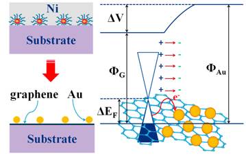 石墨烯是一种由sp2杂化的碳原子构成的二维原子晶体,具有良好的电学、光学、热学和机械性能,作为一种具有极大潜力的透明电极材料,近年来备受关注。然而,尽管本征石墨烯迁移率很高,但较低的载流子浓度导致材料的电阻相对于传统的透明电极(如ITO)仍然较大,使得多数基于石墨烯透明电极材料的光电器件还没有表现出比现有器件更高的性能,限制了石墨烯透明电极在光电器件中的应用。因此我们需要对石墨烯进行适当改性,以降低石墨烯材料的电阻率。由于金具有比石墨烯更大的功函数,对石墨烯具有较好的掺杂作用,可以改善石墨烯的导电性。此外,金属纳米颗粒所具有的表面等离激元特性,也可能被用于提高器件性能。因此,找到一种直接制备石墨烯-金纳米颗粒复合材料的简便方法十分必要。