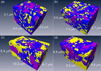 图1 利用BSRF4W1A-X射线成像实验站实验技术获得了两种Ni-YSZ阳极支撑层(NiO粉末含有不同杂质)和相同的Ni-YSZ 阳极功能层的三维成像数据,并经过数据分割处理,计算了各自的一些关键结构参数,比如各相的体积分数、联通性以及三相界面长度等,这为关联阳极结构与性能提供了关键的数据信息。