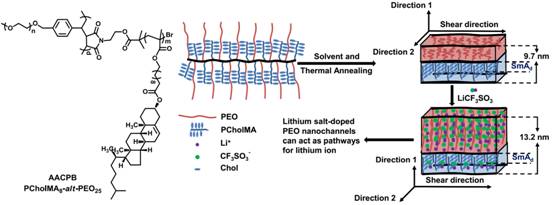 图1. AACPB的化学结构式以及未掺杂锂盐和掺杂锂盐的AACPB的多级有序结构:层状相微相分离结构和胆甾醇液晶基元形成的SmAd液晶相