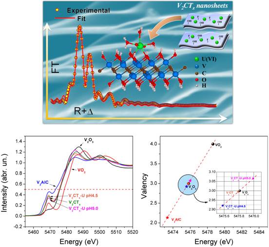 为了进一步研究V2CTx与铀酰离子的相互作用机理,该研究组利用同步辐射技术对铀原子周围的配位结构信息进行解析,扩展X射线吸收精细结构谱(EXAFS)结果表明铀酰离子与该片层材料钒活性位点上的两个羟基结合形成了稳定的二齿配合物,从而实现对U(VI)快速高效吸附。同时利用第一性原理建立模型进行理论计算,得到V2CTx-U配合物的能量最优构象和配位模式均与EXAFS结果保持一致。此外,还通过X射线吸收近边结构光谱(XANES)对V2CTx以及母体材料V2AlC中V的价态进行了估算。
