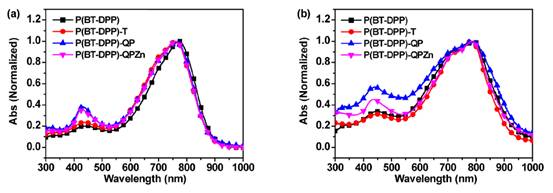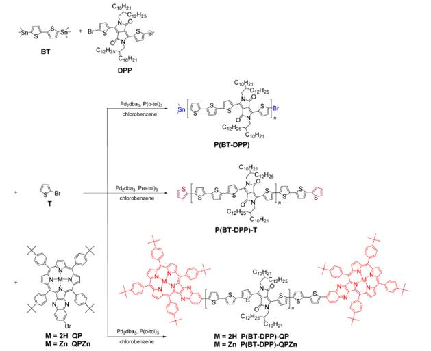 本研究中,我们通过斯蒂勒偶联反应,将2-2’-联噻吩(BT)和吡咯并吡咯二酮(DPP)分别作为给体和受体单元,使用封端单元噻吩(T)、喹喔啉[2,3-b’]卟啉(QP)和喹喔啉[2,3-b’]卟啉锌合成了一系列封端的给体-受体型共聚物:P(BT-DPP)-T、P(BT-DPP)-QP和P(BT-QPP)-QPZn。通过与没有进行封端的对照组P(BT-DPP)进行比较,P(BT-DPP)-QP和P(BT-QPP)-QPZn两个材料由于卟啉的单元的贡献,其400-550nm处的吸收光谱明显增强。