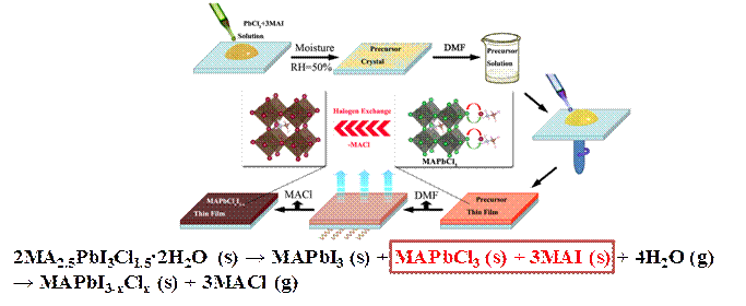 传统一步法在成膜过程中的中间产物之一为PbI2,PbI2诱导的晶格插入反应会造成晶格大尺度膨胀,从而降低晶体的结晶性和取向性,薄膜残留应力。相反,水合物前驱体晶体在退火过程中仅生成高结晶性的中间产物MAPbCl3,通过卤素交换过程得到MAPbI3-xClx钙钛矿薄膜,该过程晶格畸变较小,薄膜不容易残留应力。利用北京同步辐射装置(BSRF)1W1A-漫散射实验站技术所获得的结果进一步表明该方法得到的薄膜无明显薄膜应力残留,并在此基础上进一步对成膜过程进行分析。