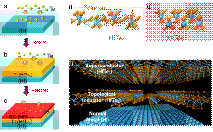 在实验方案设计之初,他们注意到五碲化铪(HfTe5)在理论上被预言为拓扑绝缘体(0.4 eV的能隙(翁红明、戴希和方忠等,Phys. Rev. X 4, 011002 (2014))。另外,三碲化铪(HfTe3)块体具有超导性质。五碲化铪和三碲化铪的结构有相似性,都具有二维层状构型(图1b,1c),五碲化铪可看成是三碲化铪的三棱镜结构通过锯齿形的碲链连接起来的。三碲化铪-五碲化铪异质薄膜有望作为一种新型的超导体-拓扑绝缘体薄膜材料,用来研究马约拉纳费米粒子等新奇物理现象。