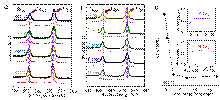 图2 三碲化铪-五碲化铪叠层材料形成过程的原位XPS分析。(a)将沉积有碲颗粒的样品在不同温度下退火,500 ℃碲原子和基底铪原子反应,开始形成五碲化铪膜。(b,c)样品保持在560 ℃延长退火时间,处于最顶部的五碲化铪形成三碲化铪膜,约5分钟后三碲化铪与五碲化铪的比例保持不变。