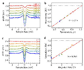 图5 Hf(0001)面上制备的三碲化铪-五碲化铪叠层材料的隧道电流微分谱。(a, b)变温实验数据,(c, d)变磁场实验数据,揭示了三碲化铪的超导电性。