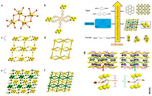 金属-有机框架化合物(Metal-organic frameworks, MOFs)因其独特的结构和广泛的应用(吸附、分离、分子识别和催化等)而广受关注。基于铀酰节点的MOFs化合物(UOFs)的结构设计与性质研究是一类锕系-金属有机框架材料,对于加深锕系配位化学研究、扩展锕系材料的潜在应用具有重要价值。与过渡金属及镧系金属的MOF相比,铀酰离子在水或非水溶剂中复杂的水解可能性使得自组装体系中铀酰和配体的配位行为更加难以预测和控制,但也赋予铀酰有机框架化合物(UOF)更多的配位模式和拓扑形态,有可能获得具有特殊结构基元或拓扑结构的新型铀酰-有机材料。中科院高能物理研究所石伟群课题组和四川大学化学院夏传琴课题组以有机碱作为模板,通过系统调控合成条件,成功获得了一类新型基于四核铀酰节点的铀酰-有机二重穿插网络材料,相关的研究成果发表在2016年1月28日的《Chemical Communications》上。(Chem. Commun. 2016, 52, 1641-1644.)