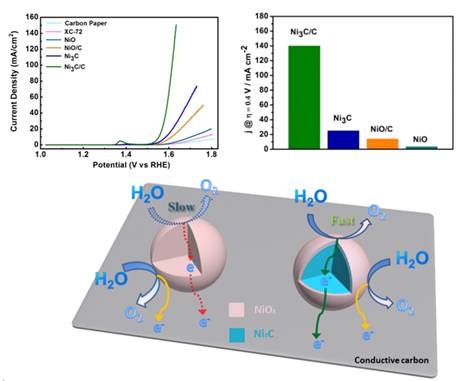 该研究组构建了金属态Ni3C纳米颗粒与导电碳的杂化结构(Ni3C/C),发现Ni3C本征金属态的特性可以加快电荷在电催化剂体相内的传输,导电碳的支撑又促使了电荷在电催化剂表面的传导。受益于双重电输运的协同调控,Ni3C/C实现了显著增强的电催化析氧性能。例如在0.4V的过电位下,Ni3C/C的OER电流密度高达140 mA/cm2, 分别是金属态Ni3C,NiO/C和绝缘态NiO的5.6倍,10倍和40倍。
