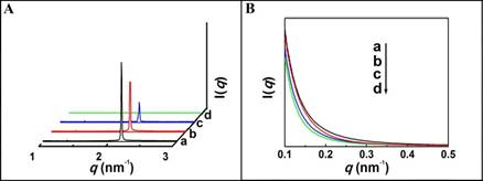 小角X-射线散射(SAXS)技术,是有序结构的有效方法。该团队利用北京同步辐射装置1W2A–小角散射实验站完成了SAXS实验,研究了不同CH2Cl2浓度对含有80 wt% DmimCl和20 wt%水的离子凝胶的影响。实验结果表明当体系中不含有CH2Cl2时,SAXS图中存在一个尖锐的衍射峰,说明体系中存在有序结构。随着CH2Cl2浓度的增加,衍射峰逐渐变弱,当CH2Cl2浓度高于25 wt%时,衍射峰完全消失,说明凝胶结构被破坏。由于水和CH2Cl2完全不互溶,因此,随着CH2Cl2的加入,溶液中会存在CH2Cl2液滴。随着CH2Cl2浓度的增加,SAXS曲线向低q区移动,说明溶液中CH2Cl2液滴的尺寸增加。离子液体特征尺寸d的减小说明参与形成聚集的离子液体数量变少。而SAXS峰位置移动很小,说明CH2Cl2的加入并不会对结构的有序性造成太大的影响。DmimCl为长链离子液体,具有表面活性剂性质,在凝胶中形成微乳液结构。同时,离子液体在连续相中会聚集形成3 nm左右的结构。