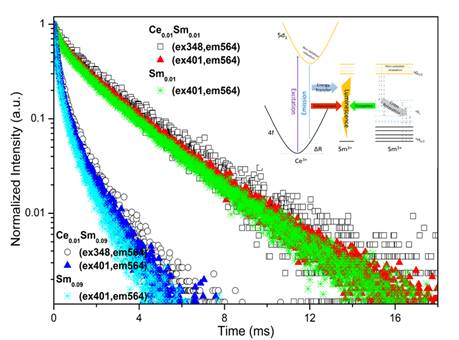 研究发现材料中广泛存在的能量传递及电子非辐射弛豫现象显著影响到掺杂稀土离子的光谱性质及荧光衰减规律,并且这种影响在Ce3+-Sm3+共掺杂的材料中尤为明显。通过实验表征,该研究组发现导致Ce3+的荧光发生温度猝灭的原因主要是布局于外层5d轨道电子的热电离作用而不是多声子弛豫作用。对于Sm3+离子来说,研究证明不同Sm3+离子之间的交叉弛豫作用是降低其荧光的主要原因,并且这种交叉弛豫通道被确定从属于偶极-偶极相互作用。在共掺杂体系中,Ce3+-Sm3+离子之间的能量传递加强了Sm3+离子的荧光强度。通过对体系中掺杂离子-掺杂离子及掺杂离子-基质相互作用的研究,该研究指出了体系中浓度猝灭,温度猝灭及通过不同通道进行能量传递对材料荧光特性的影响。