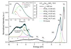 图1 利用北京同步辐射装置(BSRF)4B8-真空紫外实验站提供的光源条件,详细测得了掺杂Ce3+样品在真空紫外区(Vacuum Ultraviolet, VUV)的光谱响应,并通过实验数据直接得到了Ce3+在本基质中外层5d轨道的能量分布情况。除此之外,对光谱信息的进一步研究得出了基质材料的光学带隙。这些信息对分析材料的能级能带分布起到了关键作用,对进一步构建稀土离子掺杂材料的绝对能级图给出了直接的数据支撑。