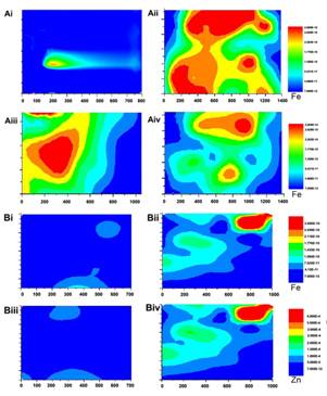 图1 μ-XRF技术检测QDs-hemin的肠铁吸收过程与元素分布。血红素铁的肠铁吸收过程 Ai:对照组;Aii:20min 后铁在十二指肠的分布;Aiii:40 min后铁在十二指肠的分布;Aiv:60 min后铁在十二指肠的分布. (B) 小肠内注射Co-distribution后40min,铁和锌在十二指肠的分布 Bi和Bii显示铁的分布,Biii和Biv显示锌的分布,Bi和Biii为对照组,Bii和Biv为QDs-hemin注射组。