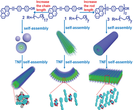 该研究组发现,π共轭分子由于其富电子的特性,可以与缺电子小分子通过供体-受体相互作用形成基于刚-柔嵌段分子的超分子聚合物。首先,作者研究了基于芘的刚-柔嵌段分子在本体和水溶液中的自组装机理,并且研究了增加柔性链长度和增加刚性部分长度对分子自组装结构的影响,这些分子在本体中形成了柱状、六方柱状、层状等超分子聚集体结构;在水溶液中自组装形成纤维、球状、多层纳米管等结构。当加入电子受体分子,形成超分子聚合物,在本体中结构转变为层状、柱状结构;在水溶液中则形成弯曲片状、纳米纤维、片状等结构。研究结果表明,供体-受体相互作用能够增强超分子自组装的驱动力,创造各种超分子纳米结构应用于纳米材料科学。这种由刚-柔嵌段分子合成超分子聚合物的策略,为构筑更复杂的功能超分子复合材料提供了坚实的理论依据。