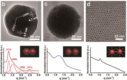 利用北京同步辐射装置1W2A线站的小角X射线散射(SAXS)研究了量子点中心之间的晶体结构和周期间距。有序超粒子的SAXS谱展现了fcc结构的(111)、(200)、(220)和(311)四个Miller指数峰,峰值计算的晶格常数分别为4.91nm(111)面和4.25nm(200)面。无序的超粒子对应的SAXS谱图为宽峰,峰位向较小的角度方向移动(q=1.20nm-1),揭示了无序超粒子中量子点排布的无序性和量子点之间间距增大。另外,有序二维阵列所对应的SAXS峰展现了一个更大的量子点间距(q=1.04nm-1)。在这项研究工作中,同步辐射光源为该研究明确认识了量子点之间的间距及超粒子结构的变化对性能的影响提供了科学的依据。