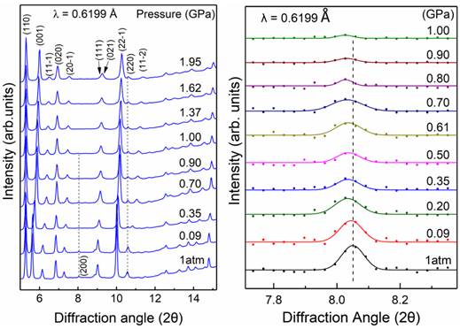 为研究硫氰酸钴吡嗪的高压行为,该课题组在北京同步辐射(BSRF)4W2-高压实验站进行了高压XRD实验,实验最高压力为1.95GPa。图2是硫氰酸钴吡嗪晶体的XRD谱在高压下的变化。从图中可以看出,随着压力的升高,(200)衍射峰向低角度方向移动,表明(200)面间距随着压力的增大而增大。晶体沿垂直于面(200)的方向负压缩。对XRD谱进行精修,结果表明晶格参数β随压力增大而减小。进一步分析表明晶体内部分子层间的滑移效应导致了β的减小,进而使得a轴在垂直于(200)面的方向上投影变大,在该方向上出现了负压缩。