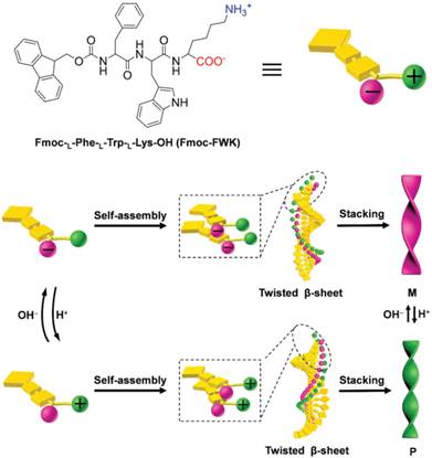 该课题组研究发现,通过调节三肽的末端电荷,能够成功制备出左手螺旋、右手螺旋和纳米平带。对组装体系进行微小的pH和温度调节,就可以改变三肽的末端电荷,从而改变静电相互作用,进而控制自组装β-折叠片扭转的方向和角度。当2.0≤pH<7.0,三肽能够组装形成右手螺旋纳米结构;当7.0≤pH<11.5,低温环境下,三肽组装形成平带结构;高温环境下,组装形成外消旋结构;当11.5<pH≤12.3,低温环境下,三肽组装形成左手螺旋纳米结构,而在高温下,组装形成无序聚集体。通过调控pH和温度,纳米螺旋的直径、螺距和手性都可以得到精确控制。此外,组装形成的三肽纳米螺旋的手性能够动态翻转,使手性材料的应用更有价值。