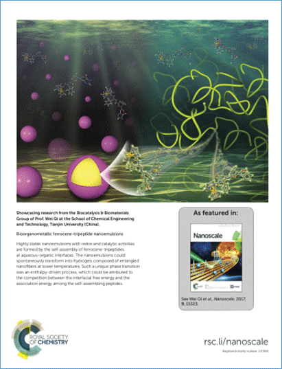 这项研究为纳米乳液的制备提供了一种新的可行性方法,得到的有机金属二茂铁-三肽纳米乳液具有结构可控、超高稳定性、氧化还原和催化活性,在食品、药物传递以及化妆品领域具有良好的应用前景。在这项工作中,同步辐射光源为二茂铁-三肽组装体的微观结构提供了直接证明。该项工作也被遴选为《Nanoscale》的背封面论文。