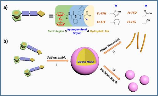 该课题组研究发现,两亲性的二茂铁-三肽能够在水相/有机相界面处排列成特殊构型,进而组装形成纳米乳液。该纳米乳液的粒径可控,通过简单调节水相/有机相比例,就可使乳滴粒径由微米级变为纳米级。纳米乳液能够在25 ℃下稳定保持四个月以上,并且在70 ℃高温下也能维持乳液状。另外,在低于25 ℃环境下,纳米乳液还能够发生熵驱动的相转变,自发转变成为具有三维网状纳米纤维结构的水凝胶。