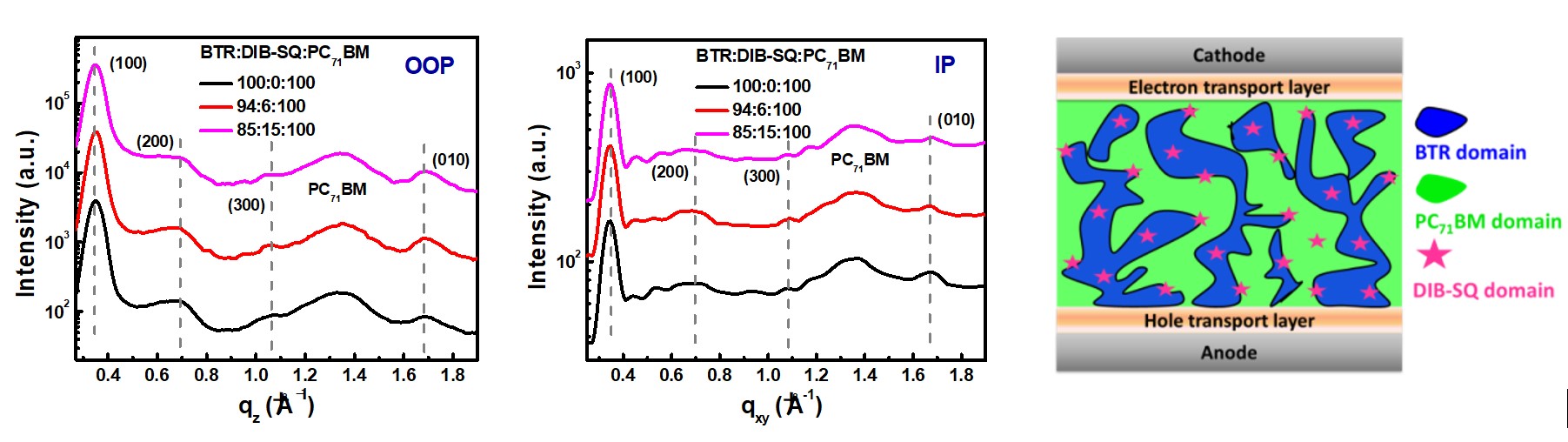 他们制备了基于BTR:DIB-SQ:PC71BM的三元SMSCs, 最优器件实现了10.3%的能量转换效率(PCE),这是基于BTR的有机太阳能电池效率最高值,相比于二元器件,性能提高了10%。在北京同步辐射装置1W1A-漫散射实验站的支持下,研究人员对三元混合薄膜内分子排布进行了GIXD表征,如图1所示。三元混合薄膜内BTR“face-on” 排布增多,这有利于载流子传输和收集。