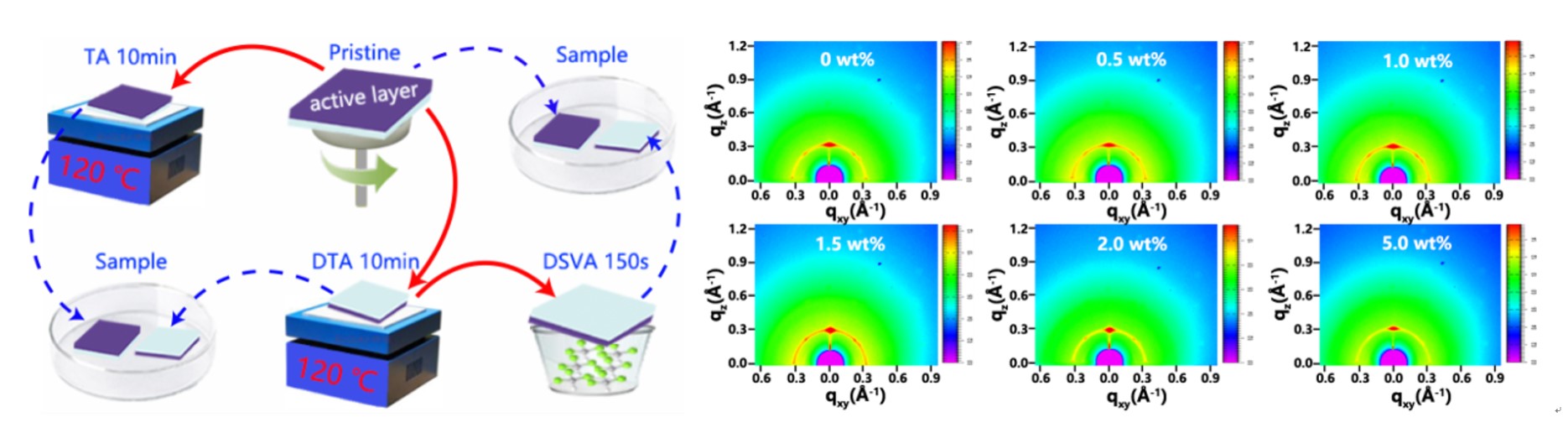 图2 活性层不同处理示意图及三元混合薄膜GIXD二维图像。