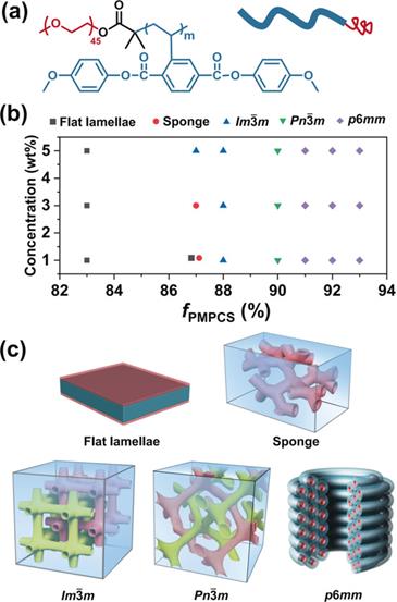 两亲性嵌段共聚物在近几十年来已经被广泛研究。在两亲性嵌段共聚物的组装中,疏水相互作用是最主要的作用力之一,可以被嵌段共聚物的浓度和形状、水含量、溶剂的性质、温度等多种因素影响。在溶液组装中,堆积参数P可以用来定性描述以上影响因素的一个综合作用(P = V/(a0lc),V和lc分别代表疏水段的体积和长度,a0代表亲水段截面面积)。随着P的增大,两亲性嵌段共聚物可以组装成囊泡、胶束、片层状结构、聚合物立方晶等多种结构。有着三维周期最小表面的聚合物立方晶和脂质自组装中的立方晶非常相似,都是在三维周期最小表面中含有两个互相穿插互不连接的连续网络。最近,聚合物立方晶在一些嵌段共聚物体系中也开始有报道出现。在聚合物立方晶形成的时候,P通常大于1。与脂质组装的立方晶对比,聚合物立方晶有着更大的周期尺寸,可以被应用到纳米模板、生化反应器、药物传输等多个领域。但是,到目前为止,溶剂、聚合物的几何结构、浓度等因素是如何影响聚合物立方晶的形成的,仍然没有被研究清楚。聚{2,5-二[(4-甲氧基苯基)氧羰基]苯乙烯}(PMPCS)是典型的甲壳型液晶高分子,在本体和溶液中都会采取伸直的链构象。